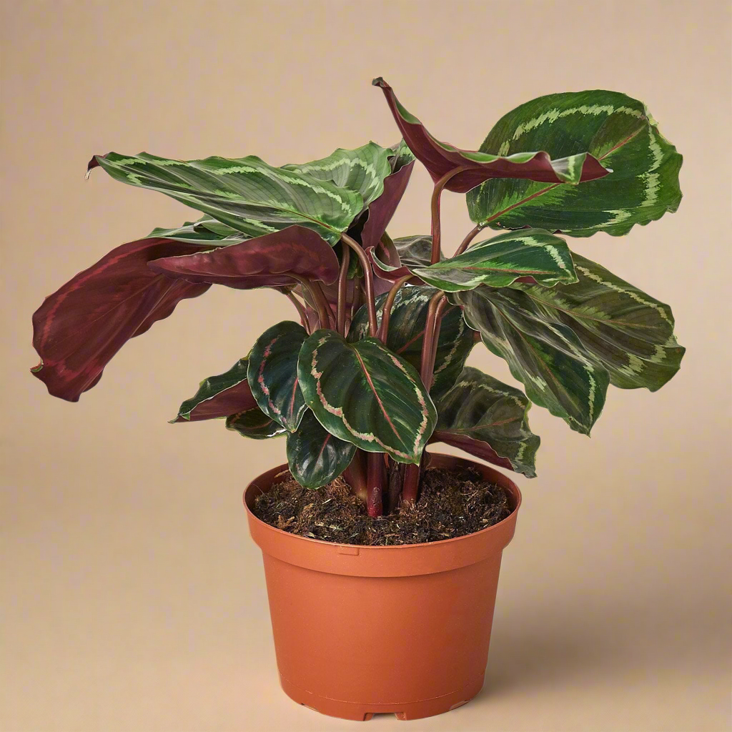 This variety thrives in bright, indirect light with consistently moist, well-draining soil and higher humidity to keep its foliage vibrant. Like other Calatheas, it is non-toxic to pets, making it a safe and stylish choice for homes with cats and dogs.