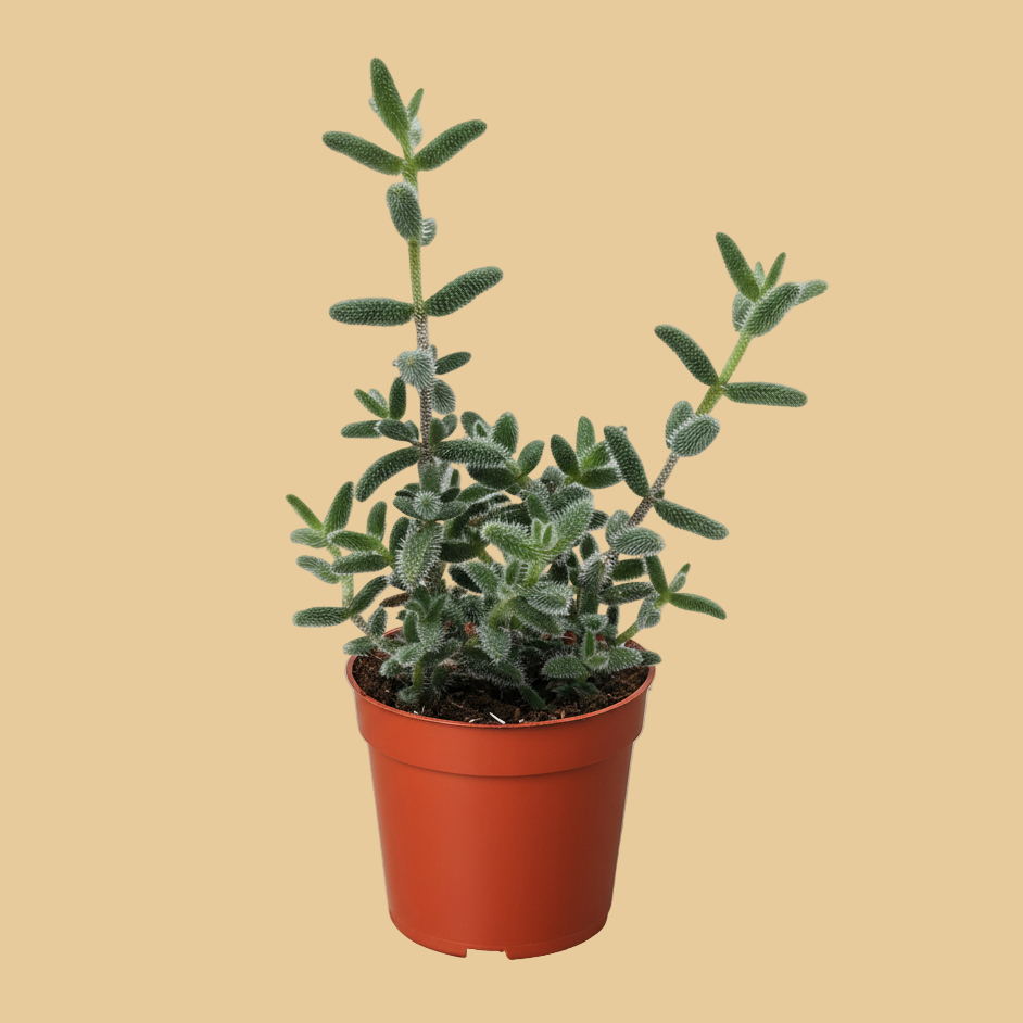 The Pickle Plant is a unique, low-growing succulent admired for its quirky, cylindrical leaves covered in soft, white spines, giving it a textured, almost fuzzy appearance. Its unusual foliage resembles tiny pickles, making it a fun and eye-catching addition to any succulent collection or container garden. In the growing season, it may produce small, daisy-like flowers that add a delicate splash of color to its distinctive greenery.