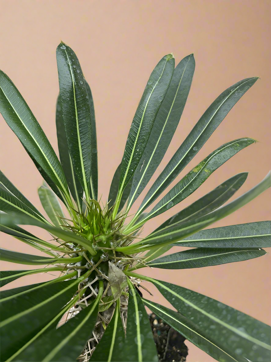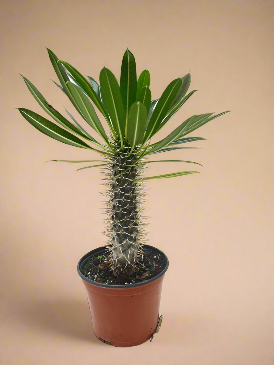Despite its name, the Pachypodium lamerei—commonly called the Madagascar Palm—is not a true palm but a unique succulent tree. It features a thick, spiny trunk that stores water and supports a crown of long, narrow, palm-like leaves. When mature and grown in the right conditions, it may even produce fragrant white flowers, adding to its exotic charm.