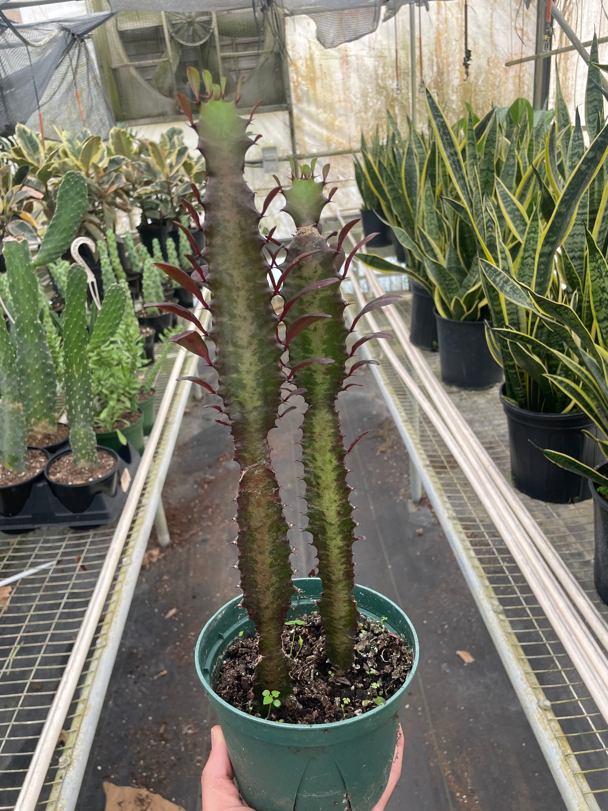 - Description: Euphorbia 'Trigona Rubra' is also known as "Royal Red". An attractive cultivar of Euphorbia Trigona with stems and leaves flushed red to magenta. The leaves can be magenta while the stems are green.