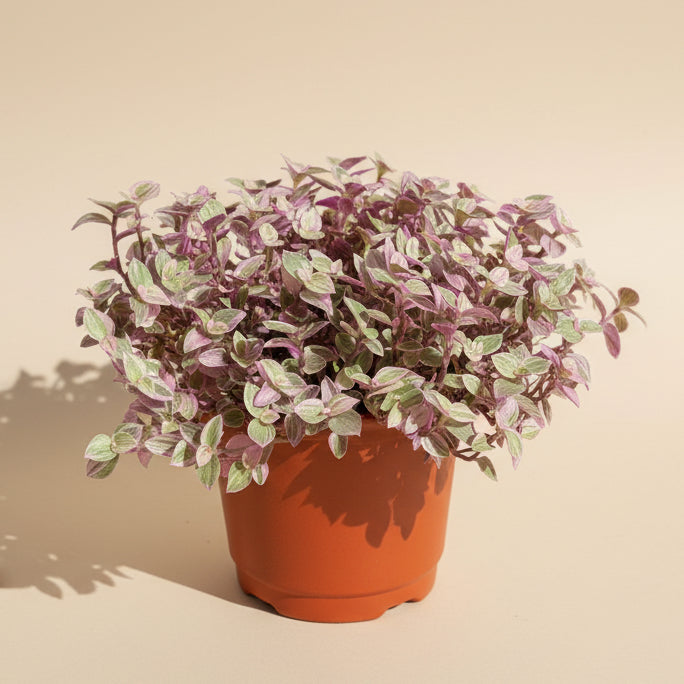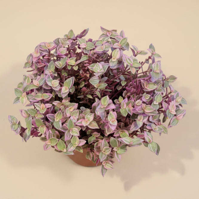 Delicate, trailing, and softly colorful, Callisia ‘Pink Panther’ is a charming groundcover-style houseplant prized for its tiny, rounded leaves dusted in shades of blush pink, lavender, and silvery green. Its cascading growth habit makes it perfect for hanging baskets, shelves, or as a spiller in mixed planters, where it creates a light, airy look.